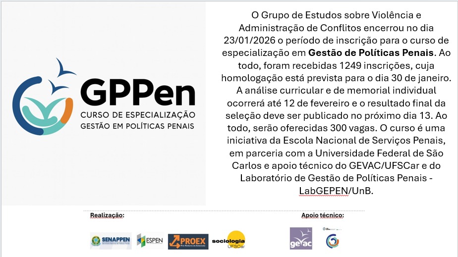 O Curso de Especialização em Gestão de Políticas Penais – GPPen, modalidade EAD, é oferecido pela Universidade Federal de São Carlos – UFSCar, por intermédio do Departamento de Sociologia, em cooperação com a Universidade de Brasília, envolvendo docentes do Departamento de Gestão de Políticas Públicas, do Departamento de Sociologia, do Departamento de Contabilidade e Departamento de Direito. Em seu caráter interdisciplinar e de ciência aplicada, o curso envolve a participação de docentes-profissionais do campo das políticas penais, reunidos por meio do Grupo de Estudos sobre Violência e Administração de Conflitos – GEVAC e do Laboratório de Gestão de Políticas Penais – LabGPen.